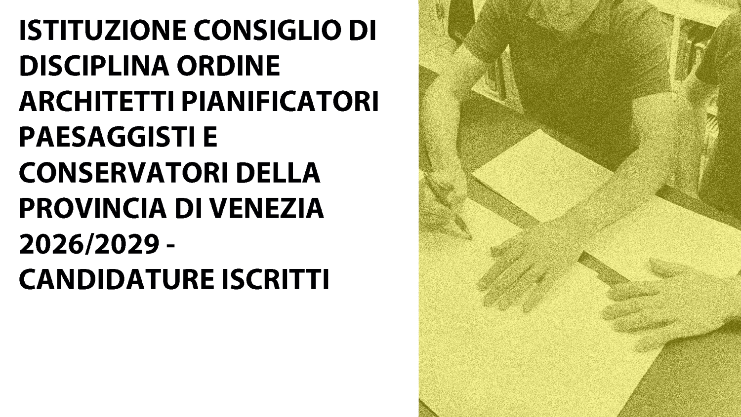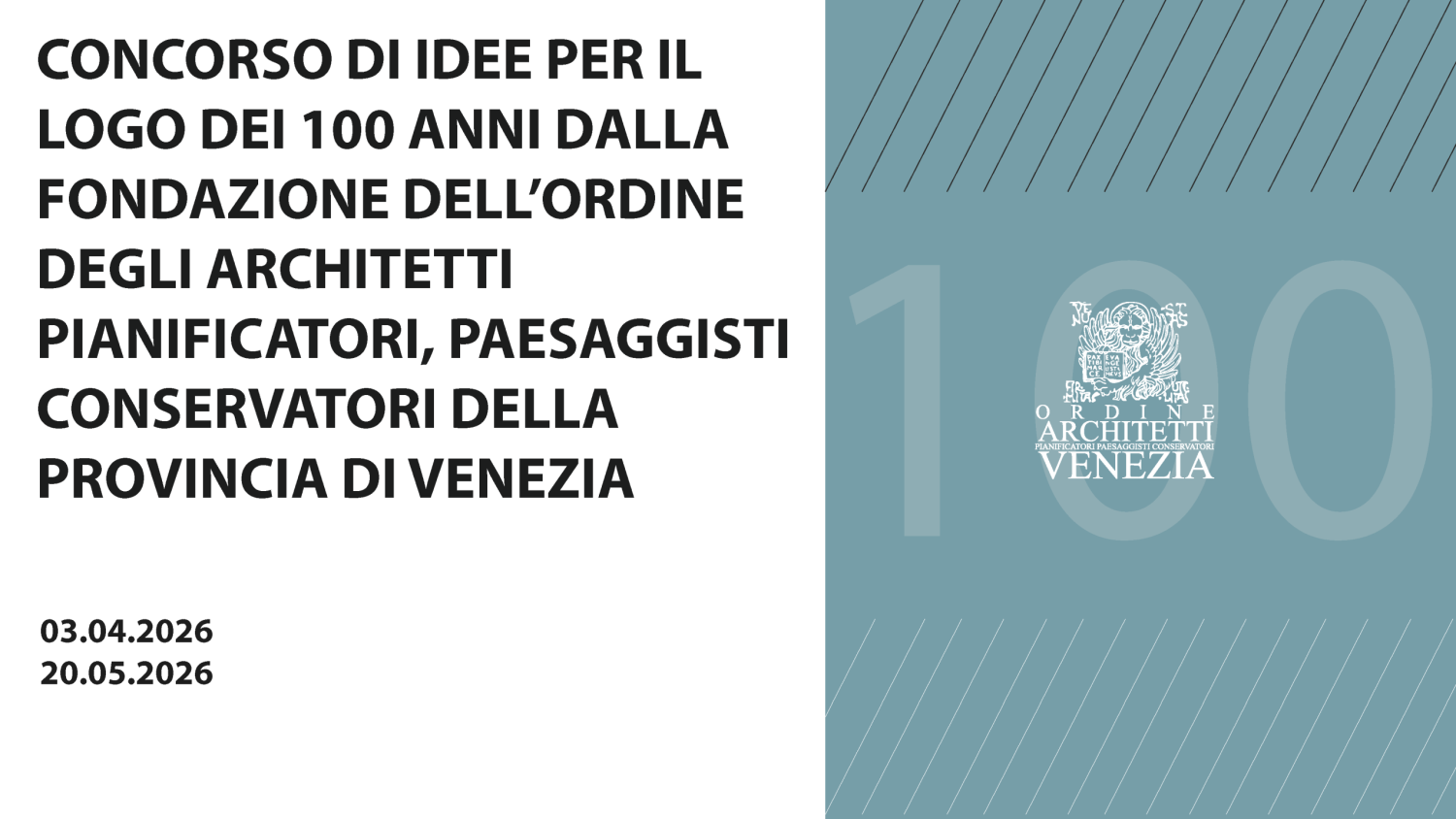 31/10/2025 > 27/02/2026 CONCORSO DI IDEE PER L’AGGIORNAMENTO DEL LOGO E DELL’IMMAGINE COORDINATA DI ORDINE E FONDAZIONE DEGLI ARCHITETTI PIANIFICATORI, PAESAGGISTI CONSERVATORI DELLA PROVINCIA DI VENEZIA