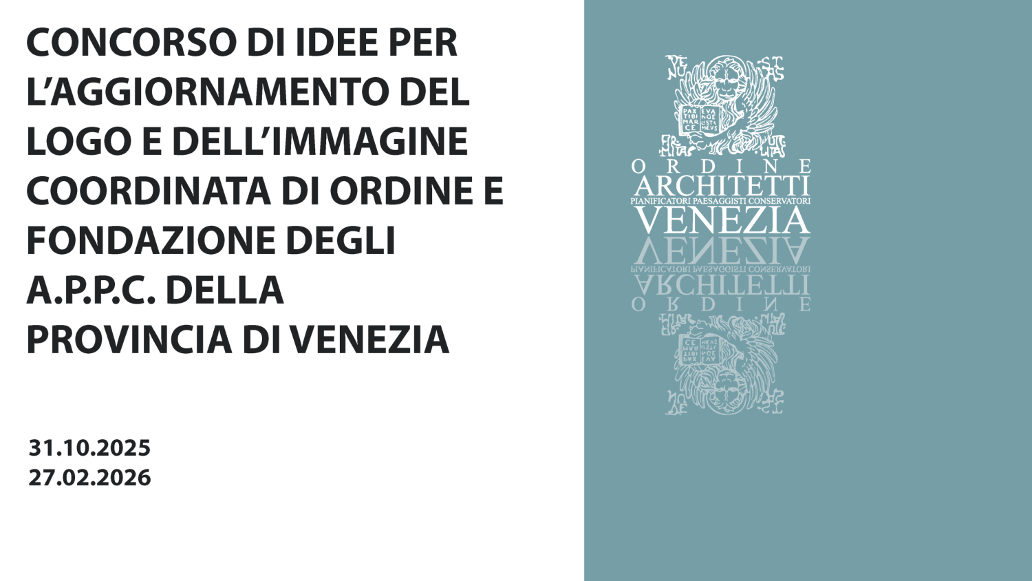 31/10/2025 > 27/02/2026 CONCORSO DI IDEE PER L’AGGIORNAMENTO DEL LOGO E DELL’IMMAGINE COORDINATA DI ORDINE E FONDAZIONE DEGLI ARCHITETTI PIANIFICATORI, PAESAGGISTI CONSERVATORI DELLA PROVINCIA DI VENEZIA